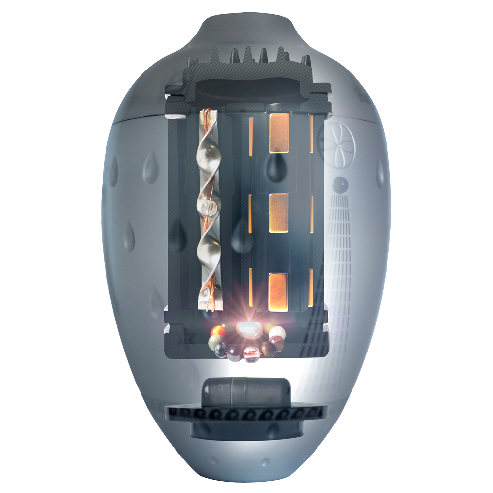 - 3 Les tourbillons créés par 3 feuilles d’argent 1000, d’or et de fils de cuivre et la structure du corps ovoïde avec traitement aux ions d’argent non amovible (méthode G.H.A) désinfectent l’eau. Ce traitement permanent émet des infrarouges, empêchant la formation de calcaire et conférant au produit une dureté qui ne se raye pas avec des éponges abrasives.